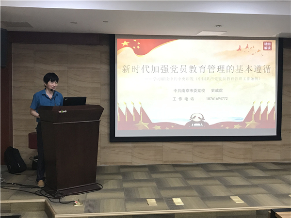 会上,南京市社会组织联合党委书记、市民政局社会组织管理局局长施惠宇解读了习近平总书记关于“不忘初心,牢记使命”主题教育的重要讲话,明确了新时代下党建工作及党员教育管理的新特点、新要求、新方法,对各单位落实“不忘初心,牢记使命”主题教育工作指明了方向,提出了要求。之后,南京市市委党校党史党建教研部史成虎教授给党员上了一堂精彩的党课,史教授介绍了《中国共产党党员教育管理工作条例》的基本情况及背景意义,并对《条例》进行了逐条精读解析,最后阐述了做好新时代党员教育管理工作的要求。解读细致入微,讲演饱含激情,在场党员深受鼓舞,受益匪浅。