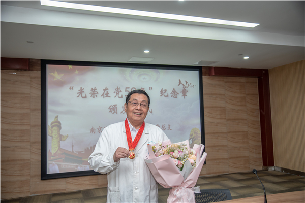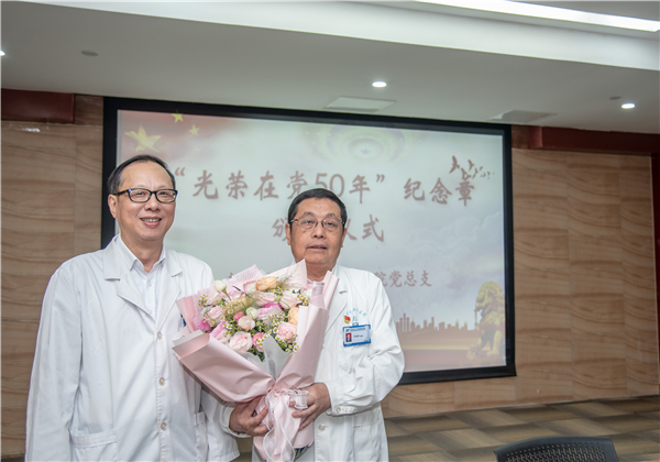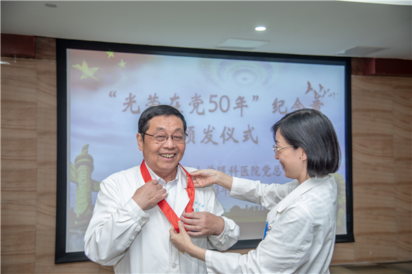 7月17日,我院举行“光荣在党50年”纪念章颁发仪式,与会人员一同高唱国歌,随后,姚进书记和蒋沁院长共同为已在党50年的老党员于志平同志颁发纪念章。