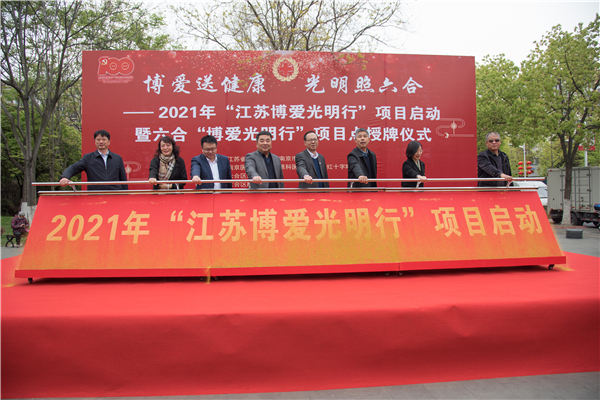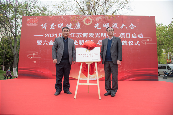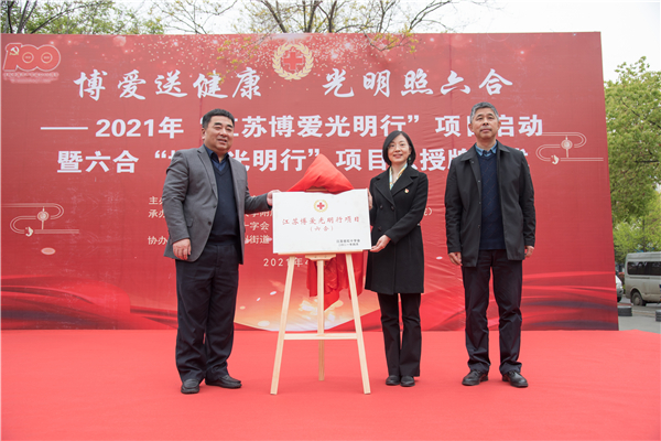 启动仪式上江苏省和南京市红十字会为南京医科大学眼科医院六合分院颁发了“江苏博爱光明行”项目(六合)铜牌,省红十字会为南京医科大学眼科医院(江苏省红十字眼科医院)颁发了“江苏博爱光明行项目技术指导单位”铜牌。眼科医院红十字博士志愿者、南京市统战部“党外人士蒋沁工作室”眼科专家,开展了眼科义诊、白内障筛查活动,共筛查240多人次,白内障适应症63 人,对符合手术条件及符合“江苏博爱光明”项目标准的,将申请红十字手术费补助。
