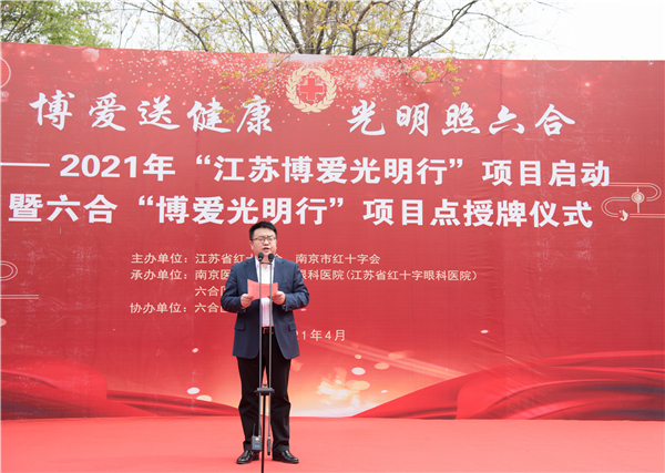 4月14日上午,由省、市红十字会开展的白内障2021“江苏博爱光明行”项目启动仪式在六合区雄州街道万汇市民广场举行,随着江苏省红十字会党组成员副会长赵凯、南京市红十字会党组成员、副会长张杰、六合区副区长徐仁平、六合区红十字会常务副会长、卫健委副主任 张 弛、南京医科大学眼科医院院长蒋沁、副院长、六合分院院长姚进等相关领导共同推动启动杆,标志着2021“江苏博爱光明行”项目在全省正式启动。六合百姓及省内符合“博爱光明行”资助标准的白内障患者将能及时手术,并享受红十字会相关手术费资助。