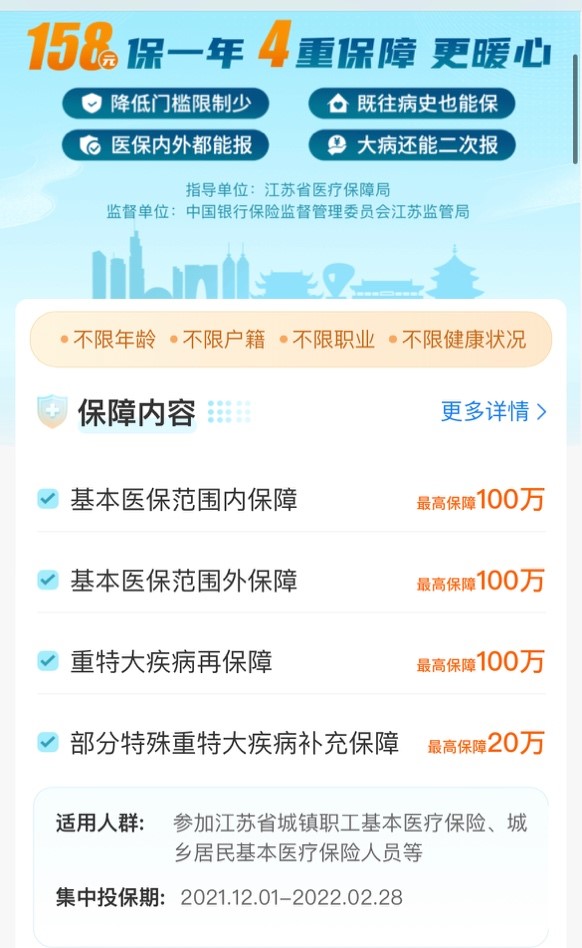为了切实提升全省参保人员的医疗保障水平,特别是有效缓解重大疾病患者家庭“因病致贫、因病返贫”等难题,2021年12月1日,在江苏省医疗保障局指导、中国银行保险监督管理委员会江苏监管局监督下,“江苏医惠保1号”正式上线。