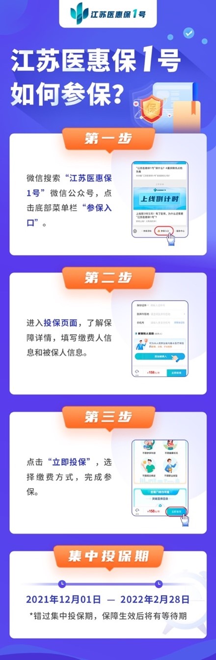 还在等什么?微信搜索“江苏医惠保1号”微信公众号,快来参保吧!