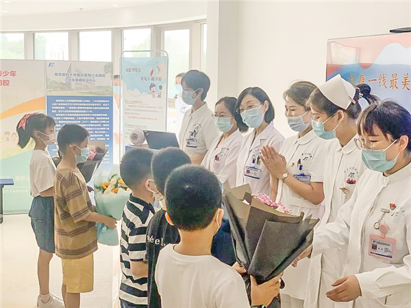 新冠疫情发生以来,医院派出多批医护工作参加南京市及省内外疫情防控核酸检测,在科普讲座开始之前,学生代表为我院抗疫英雄们献花。