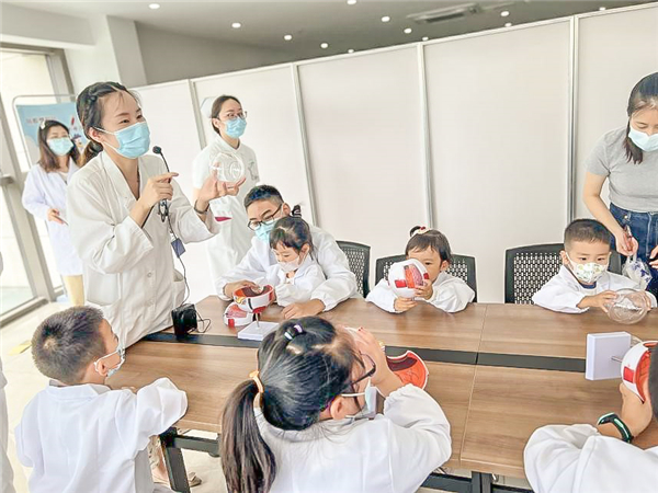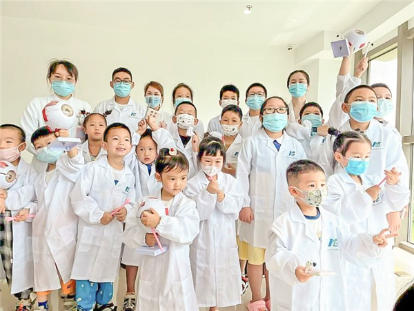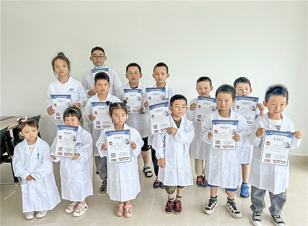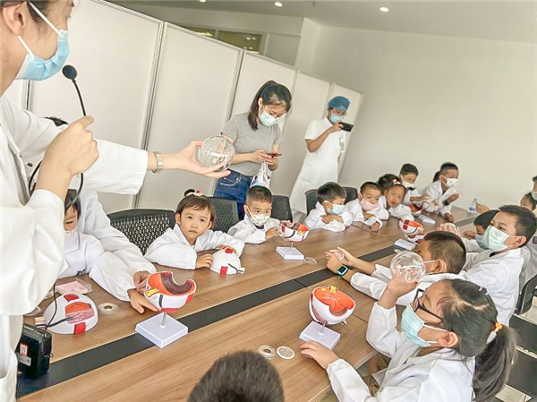 小朋友穿上白大褂,每个小脸上都写满神气和自豪,看着眼球模型,吱吱喳喳地与指导老师问个不停。指导老师宋平医生、赵依宁医生、张苏医生,分别向小朋友和家长辅导了近视如何预防、角膜塑形镜为何能防控近视、眼球的结构等知识,小朋友都听得津津有味,之后还为小朋友颁发了荣誉证书。