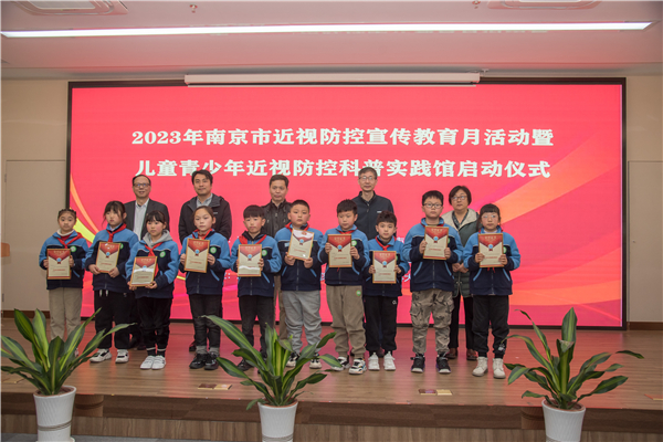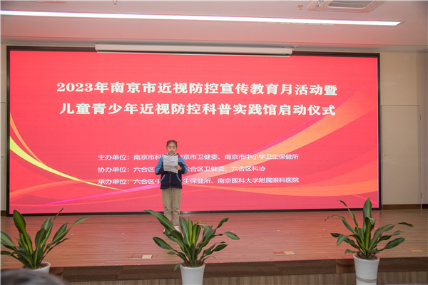 开馆仪式上,六合区教育局、区中小学卫生保健所为科普实践馆颁发了“六合区儿童青少年健康教育基地”铜牌,区卫健委颁发“六合区儿童青少年眼病防治科普宣传基地”铜牌。出席领导为“红领巾亮眼睛讲解员”颁发证书。最后,与会领导共同启动“2023年南京市近视防控宣传教育月活动暨儿童青少年近视防控科普实践馆”开馆。